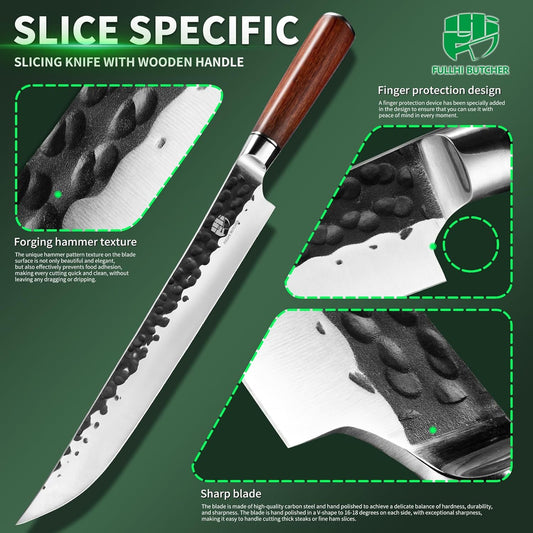 Japanisches Kochmesser, geschmiedetes, gehämmertes Filetiermesser, 25.4 cm Küchenmesser mit Box, Kochmesser aus kohlenstoffreichem Stahl zum Schneiden und Tranchieren von Schinken mit Palisanderholzgriff, personalisierte Geschenke für Damen und Herren, Ge