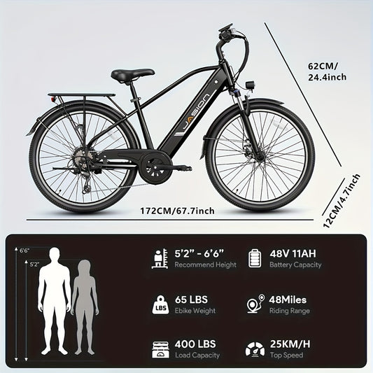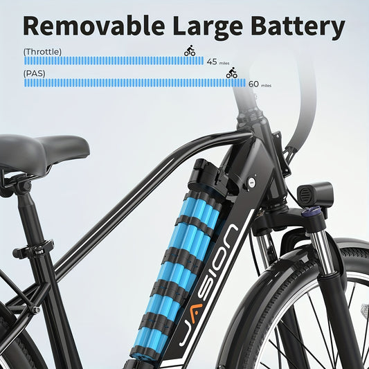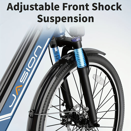 Jasion Roamer Erwachsenen-Elektrofahrrad, 250 W Nennleistungsmotor, 528 Wh herausnehmbarer Akku, bis zu 60 Meilen, 25 km/h City-Cruising-Elektrofahrrad, 26-Zoll-Pendler-Elektrofahrrad, 7-Gang-Schaltung und Vorderradfederung