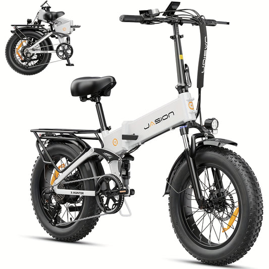 Jasion X-Hunter Elektrofahrrad für Erwachsene, 250 W Spitzenmotor, 25 km/h Höchstgeschwindigkeit, 48 V 13 Ah Akku, Vollfederungssystem, 20 Zoll * 4.0 Fat Tire Faltbares E-Bike 7-Gang-Fahrrad