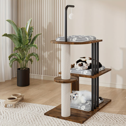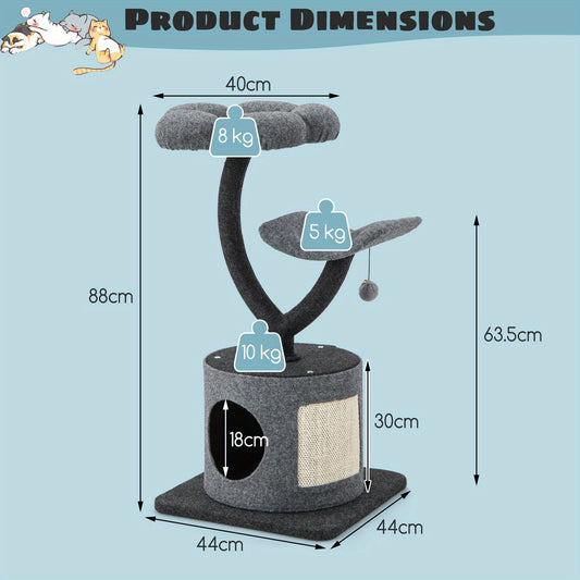 Kratzbaum 88cm Katzenbaum mit gebogenem Metallrahmen, Sisalkratzbrett, 2 Liegeflächen & Höhle, Katzenkratzbaum, Kletterbaum, Katzenhaus, Katzenmöbel für große und kleine Katzen, Grau