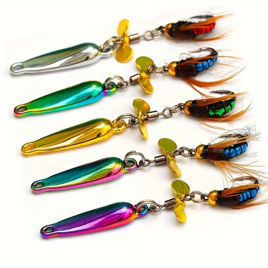 Set of 5 Reflective Zinc Alloy Fishing Spoons with Rotating Swivels - Artificial Insect Lure for Salmon and Trout, Durable Bait with Fly Hooks for Angling Accessories