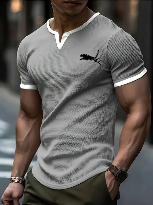 Sommermode für Herren, Henley-Shirt mit Leopardenmuster und V-Ausschnitt, kurzärmelig, lässiges und trendiges Waffelstrick-Oberteil für die Freizeit im Freien
