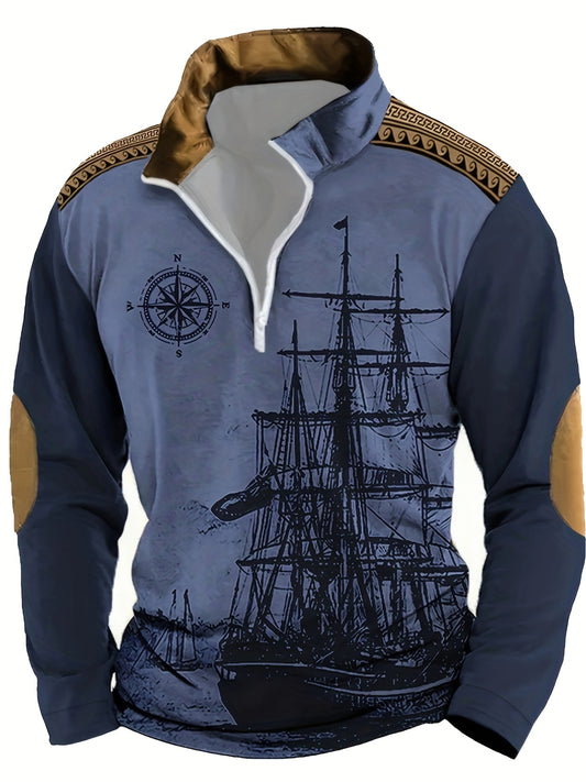 Vintage-Nautik-Schiff-Druck-Henley-Sweatshirt für Männer - 100% Polyester-Henley-Oberteil mit Schalkragen, leicht elastisches Gewebe, Reißverschluss-Detail, lockerer Sitz, gestrickt - Herbst/Winter-Casual-Pullover