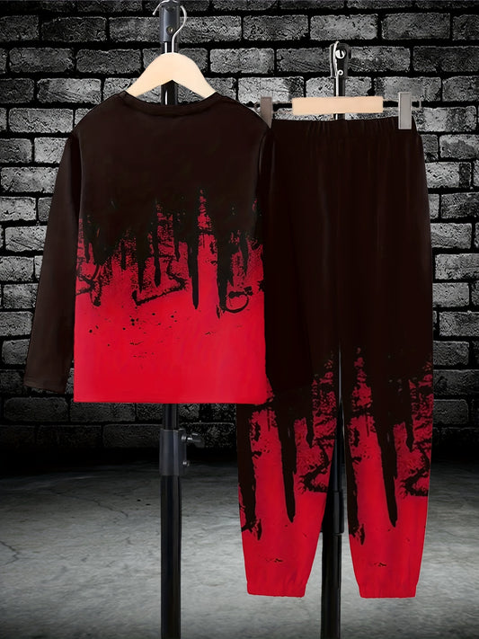 2er-Set Herren Frühling/Sommer/Herbst Laufanzug mit Leopardenmuster in Schwarz und Rot - Atmungsaktives Rundhals Langarm-T-Shirt und Bequeme Lange Hose mit Elastischem Bund und Taschen - Komplettes Freizeitoutfit für Herren für Warmes Wetter