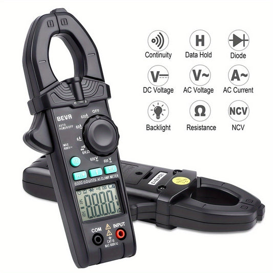 BEVA Zangenamperemeter Stromzange, Handheld-Digitalmultimeter Multitester 6000 Zählimpulse, für AC/DC-Spannung, Wechselstrom, Widerstand, Diode, Batterietest, LCD-Bildschirm mit NCV und Batterie