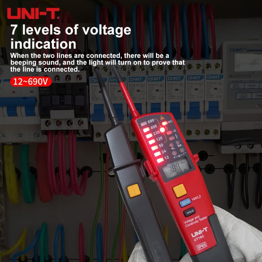 1 Stück UNI-T Spannungs- und Durchgangsprüfer, Industrieller Spannungsdetektor 12 V-690 V, Batteriebetrieben, LCD-Hintergrundbeleuchtung, RCD-Test, Lautlosmodus, Arbeitsleuchte, 7 Spannungsanzeigestufen, Keine Batterie enthalten