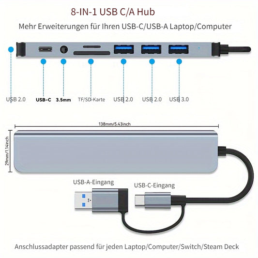 3.0 Hochgeschwindigkeits-USB-C-Hub USB-Splitter 8-in-1 USB-Verlängerung mit 4 USB-Anschlüssen und 1 USBC TF/SD-Kartenleser 3,5-mm-Audioausgang, geeignet für MacBook Pro/iPad Pro/HP-Laptops/Galaxy-Telefone (1 bis 8)