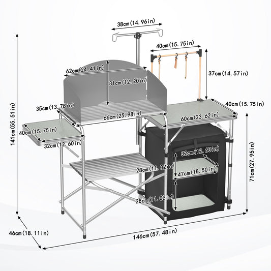 Camping Küchentisch, Klappbarer Outdoor-Kochtisch mit Aufbewahrungstasche, Aluminium-Kochstation mit Schränken und abnehmbarer Windschutzscheibe, 146 x 46 x 141 cm
