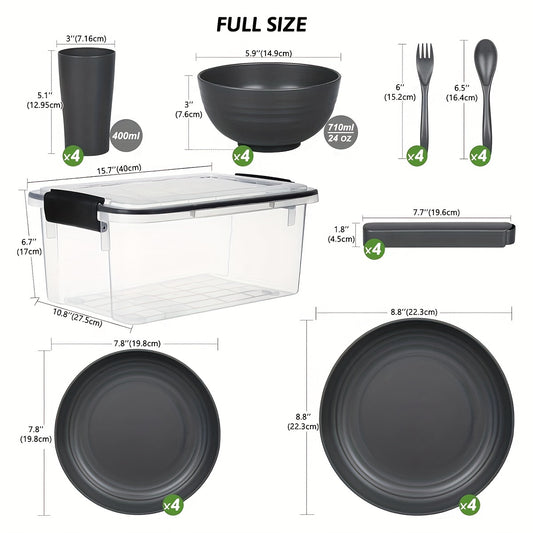 29-teiliges Campingbesteck aus Kunststoff, unzerbrechliches Besteckset mit Box und Besteck für 4 Personen, Picknickbesteck, Plastikbesteck mit Tellerset, Schüssel, Becherset Outdoor, RV Greentainer