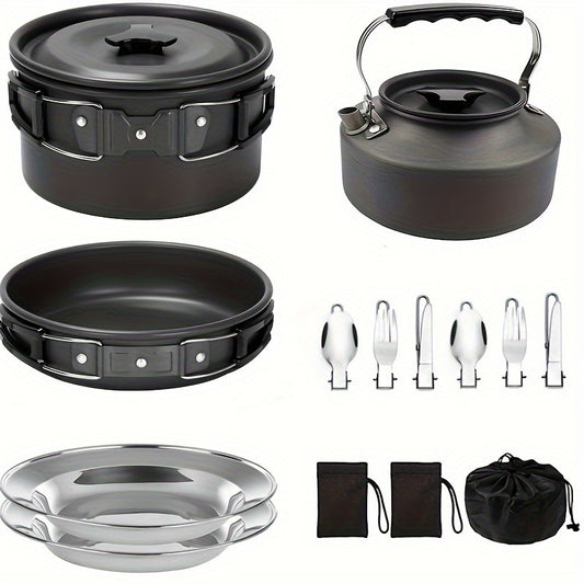 1-Set Camping Kochgeschirr - Ultraleichtes, robustes Kochset mit Antihaft-Pfanne, kompaktem Wasserkocher und komplettem Besteck - Ideal für 2-3 Personen, umfassendes Geschirrset für Outdoor-Abenteuer