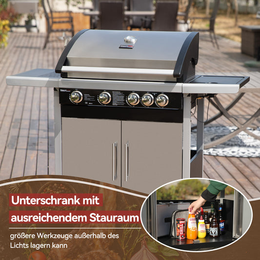 Royal Gourmet 4+1 Brenner Gasgrill Grillwagen mit Unterschrank, Edelstahlbrenner mit 14,5 kW und automatischer Zündung Campinggrill mit Seitenbrenner Silber