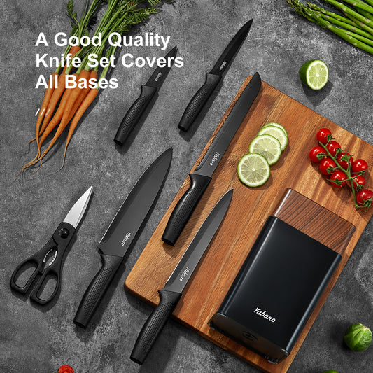 Yabano Messer-Set, Yabano 7-teiliges Küchenmesser-Set mit Universal-PE-Messerblock, Messerblock-Set mit eingebautem Schärfer, schwarze Küchenmesser zum Schneiden, Schneiden, Würfeln & Schneiden
