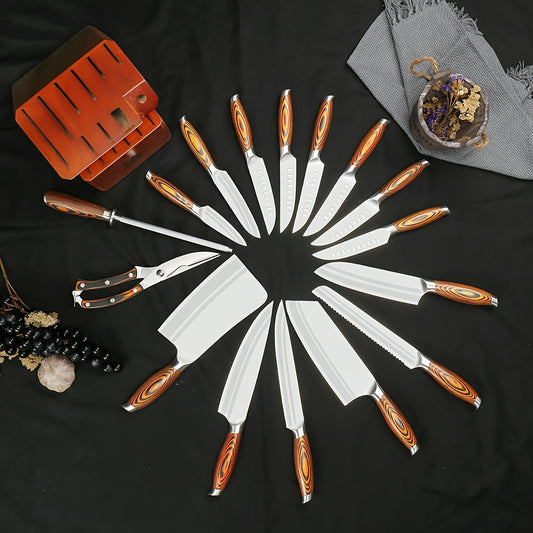Messerblock Set mit Messerschärfer, 15-teiliges Kochmesser-Set mit Block aus Holz, Küchenmesser aus kohlenstoffreichem Edelstahl in Box, Holzgriff in Farbe