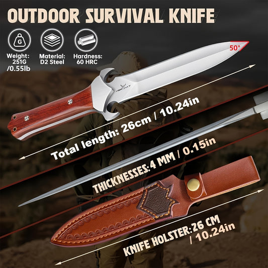 Outdoormesser, feststehende Klinge, scharf, D2 Stahl Gürtelmesser & Messer mit Lederscheide Bushcraft Campingmesser zum Wandern und Angeln