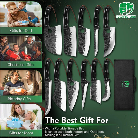 Full Tang 17-teiliges Metzger- und Kochmesserset mit Rolltasche, Küchenwerkzeuge, Schere, Hackmesser aus Kohlenstoffstahl, Küchenmesser, Gemüsespalter, für Zuhause, Grillen, Camping mit Messertasche, Geschenke für Damen und Herren, Geburtstag, Weihnachten