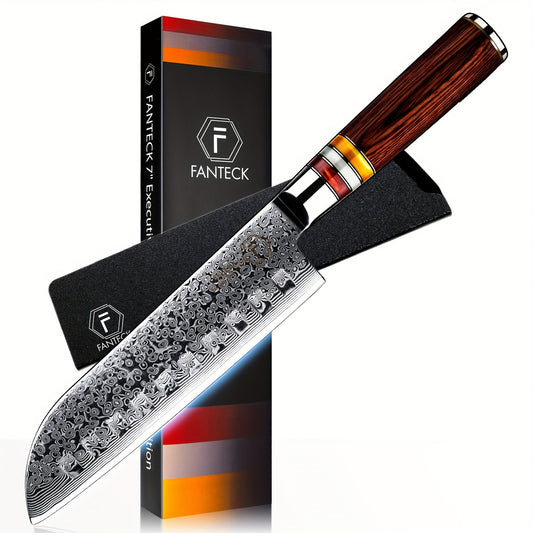 Damaskus Santoku Messer 18cm, FANTECK VG-10 Kern 67 Lagen Japanischer Edelstahl Professionelles Fleischkochmesser, Ultra Santoku Küchenmesser mit ergonomischem Holzgriff für Haushalt und Gastronomie