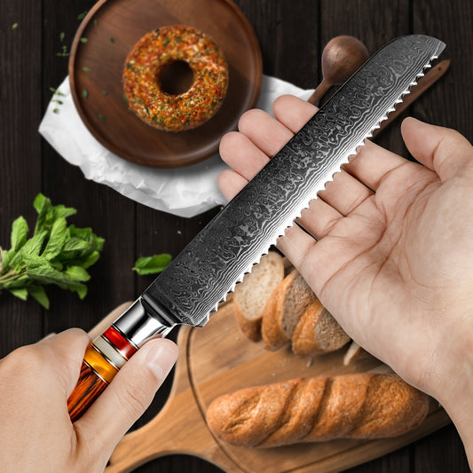 Damastkuchen-Brotmesser 20CM, FANTECK Professionelles Küchenmesser Scharf VG-10 Kern 67-Lagen Damaststahl Klinge Japanisches Brotmesser mit Wellenschliff und Pakka-Holzgriff