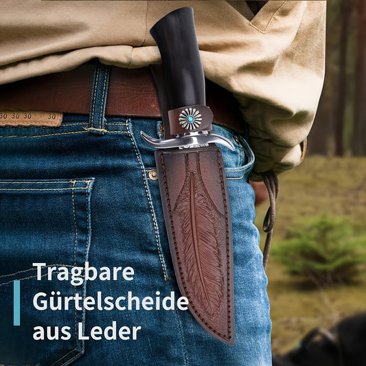 Outdoormesser, Messer mit Ebenholzgriff und Federmuster, D2 Stahl feststehende Klinge Messer mit Holster Gürtelmesser für Camping, Angeln, Trekking, Bushcraft