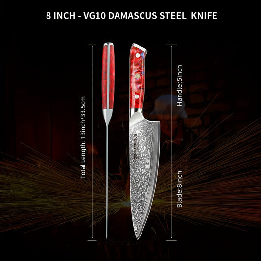 Damaszener Kochmesser 20 cm, ultrascharfer japanischer VG-10-Stahl mit Harzgriff, professionelles Kochmesser für die Küche, Sunset Red aus der Xuan-Serie