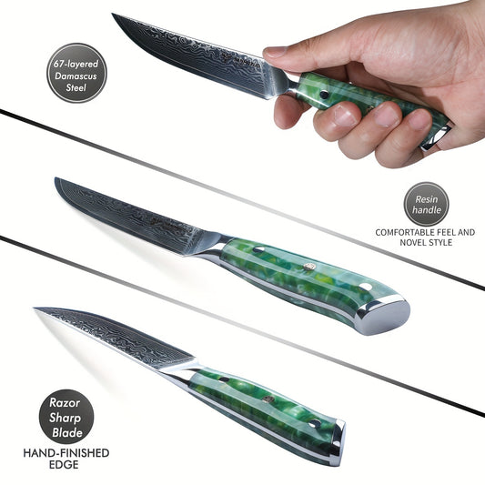 Damaszener Steakmesser-Set mit 4 Stück, ultrascharfes, nicht gezacktes Küchenmesser, 12.7 cm, ultrascharfer japanischer VG-10-Stahl mit Harzgriff, professionelles Küchenmesser-Set, Jadegrün der Xuan-Serie