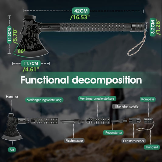 Axt 10 in 1, Spaltaxt für Holz, Scharfe Campingaxt Multitool mit Outdoormesser und Kompass, Handaxt mit Geschenkbox, Schwarzes Set für Waldreisen, Garten