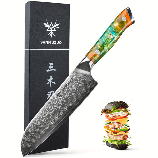 Damaszener Santokumesser 7 Zoll, ultrascharfer japanischer VG-10-Stahl mit Harzgriff, professionelles Kochmesser für die Küche, Geschenkbox