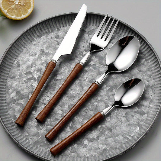 4-teiliges Steakmesser- und Besteckset im japanischen Stil, aus 304 Edelstahl mit eleganten Holzgriffen, inklusive Abendmesser, Gabel, Löffel und Essstäbchen für westliche und asiatische Küche