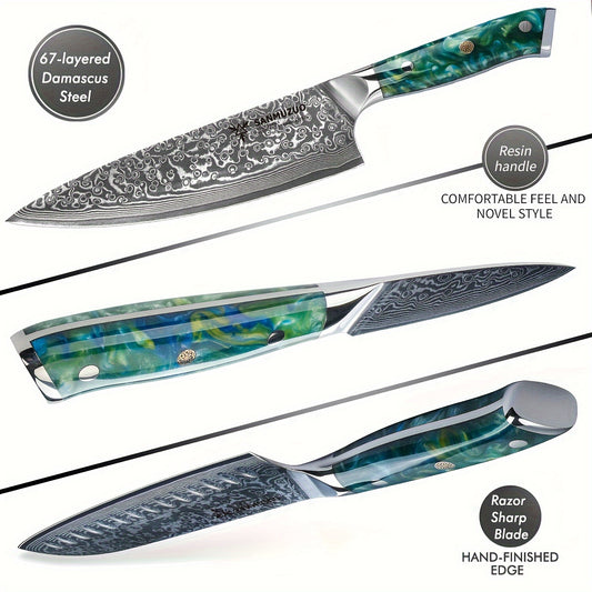 Damaszener Kochmesser-Set – 5-teiliges Küchenmesser-Set, ultrascharfer japanischer VG-10-Stahl mit Harzgriff, professionelles Küchenmesser, Jadegrün, Xuan-Serie