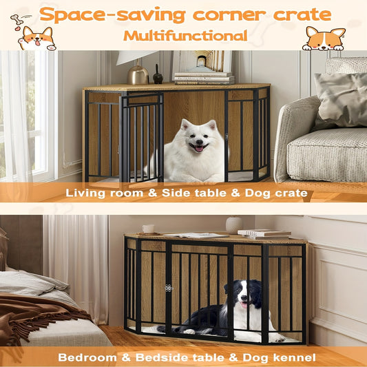Ecken-Hundekäfig für Zuhause, Indoor-Hundehütte, Indoor-Hundehaus, Hundebox mit Tür Hundekissen, für große, mittelgroße und kleine Hunde, 111 x 67 x 60 cm, Beistelltisch mit Tablett, Metall