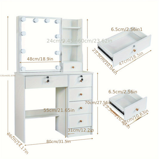 Schminktisch-Set mit 1 Set, 6 Schubladen mit 10 LED-Leuchten, weißer Schminktisch mit beleuchtetem Spiegel, Schminktisch mit Schubladen und gepolstertem Hocker für Schlafzimmer, Schminkset, 3 Beleuchtungsmodi, Helligkeit einstellbar