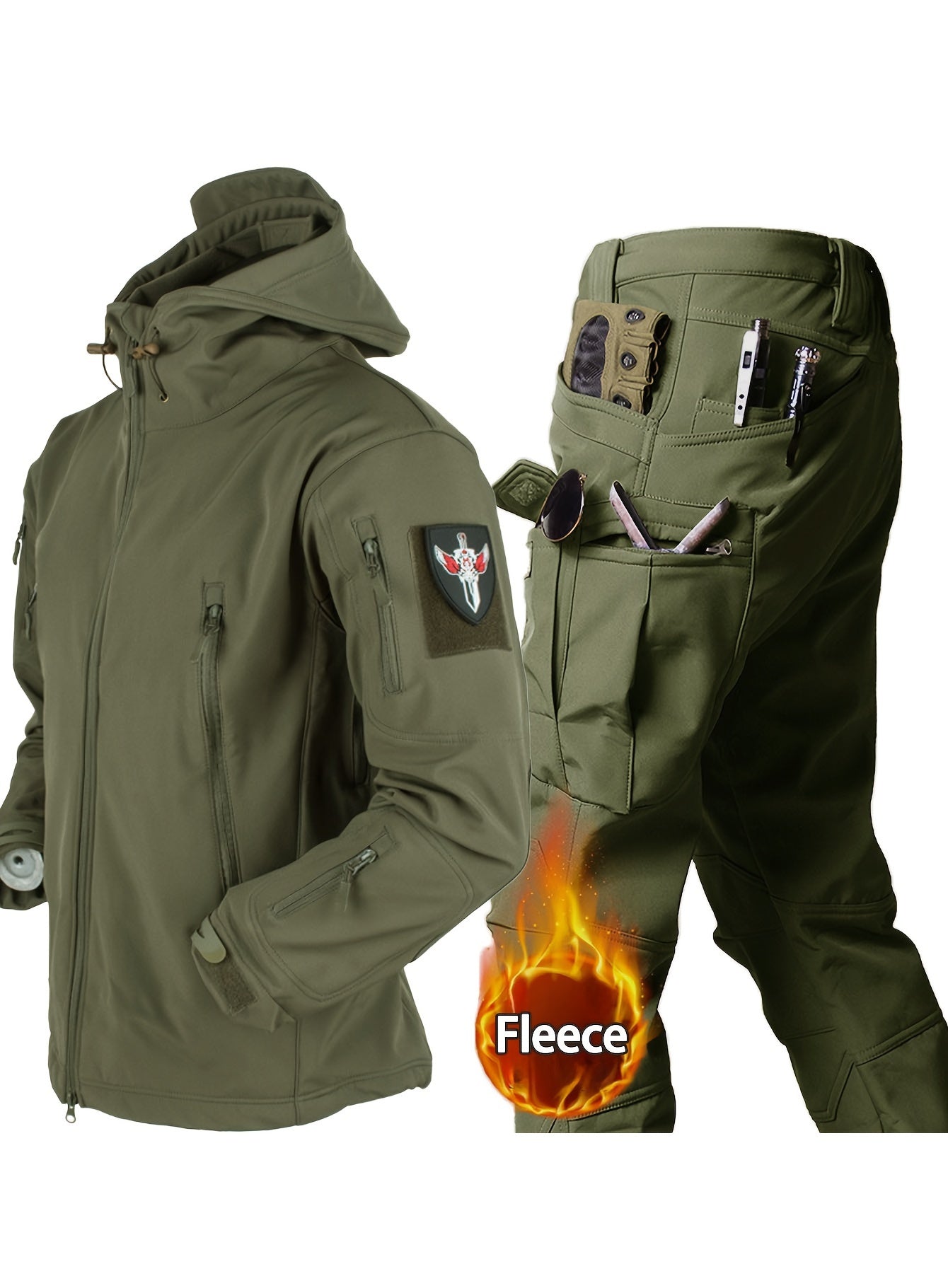 2er-Set Tarnmuster Softshell-Jacken mit Kapuze und Sharkskin-Arbeits-Cargohosen - Trainingsanzüge für Männer mit Mehreren Taschen, Winddicht und im Outdoor-Militärstil