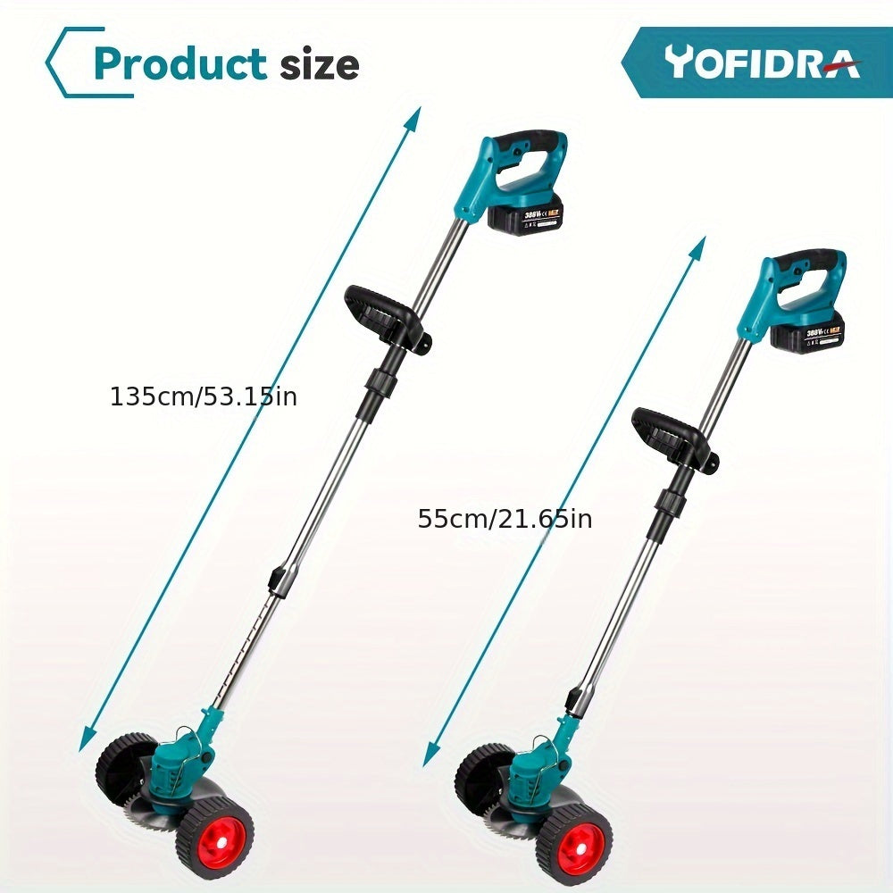Akku-Rasenmäher mit 2 Akkus und Ladegerät, 6-Zoll-Messergeschwindigkeit 12000 U/min, Körper-Teleskopbereich 100-135 cm, mit drei Sägeblättern, der Maschinenkopf kann um 180° gedreht werden, grünes Licht zeigt 10 Akkus an, elektrischer Rasenmäher, geeignet