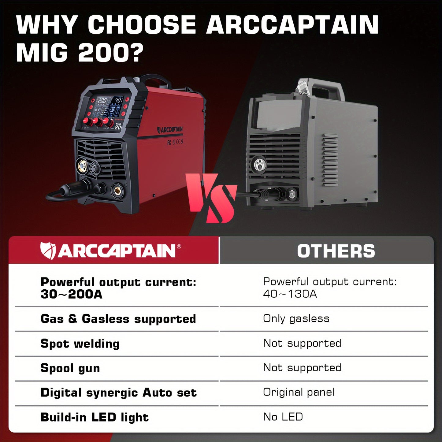 ARCCAPTAIN 6-in-1-MIG-Schweißgerät, 200-A-Gasschweißgeräte mit Flussmittelkern-MIG/Stick/Lift-TIG/Punktschweißen/Spool-Gun-Funktion