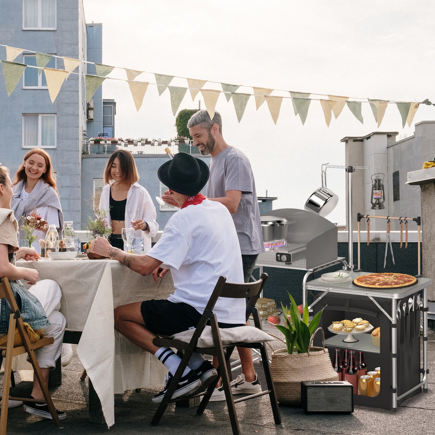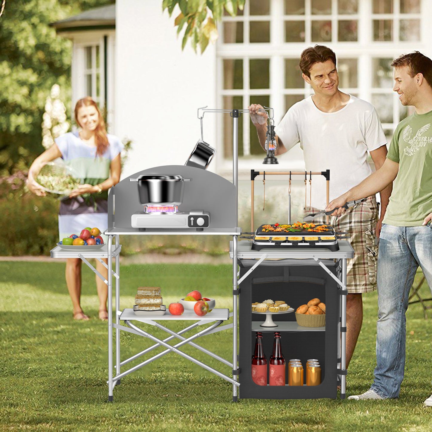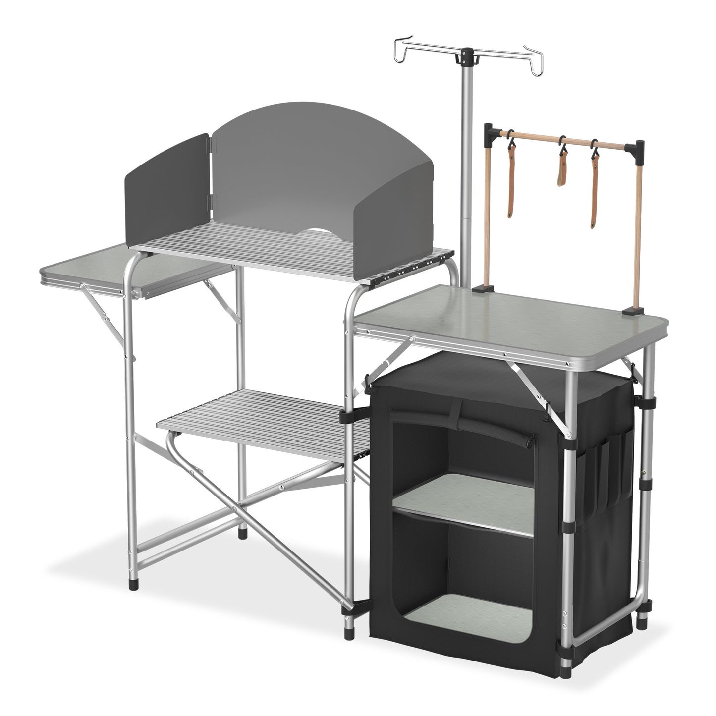 Camping Küchentisch, Klappbarer Outdoor-Kochtisch mit Aufbewahrungstasche, Aluminium-Kochstation mit Schränken und abnehmbarer Windschutzscheibe, 146 x 46 x 141 cm