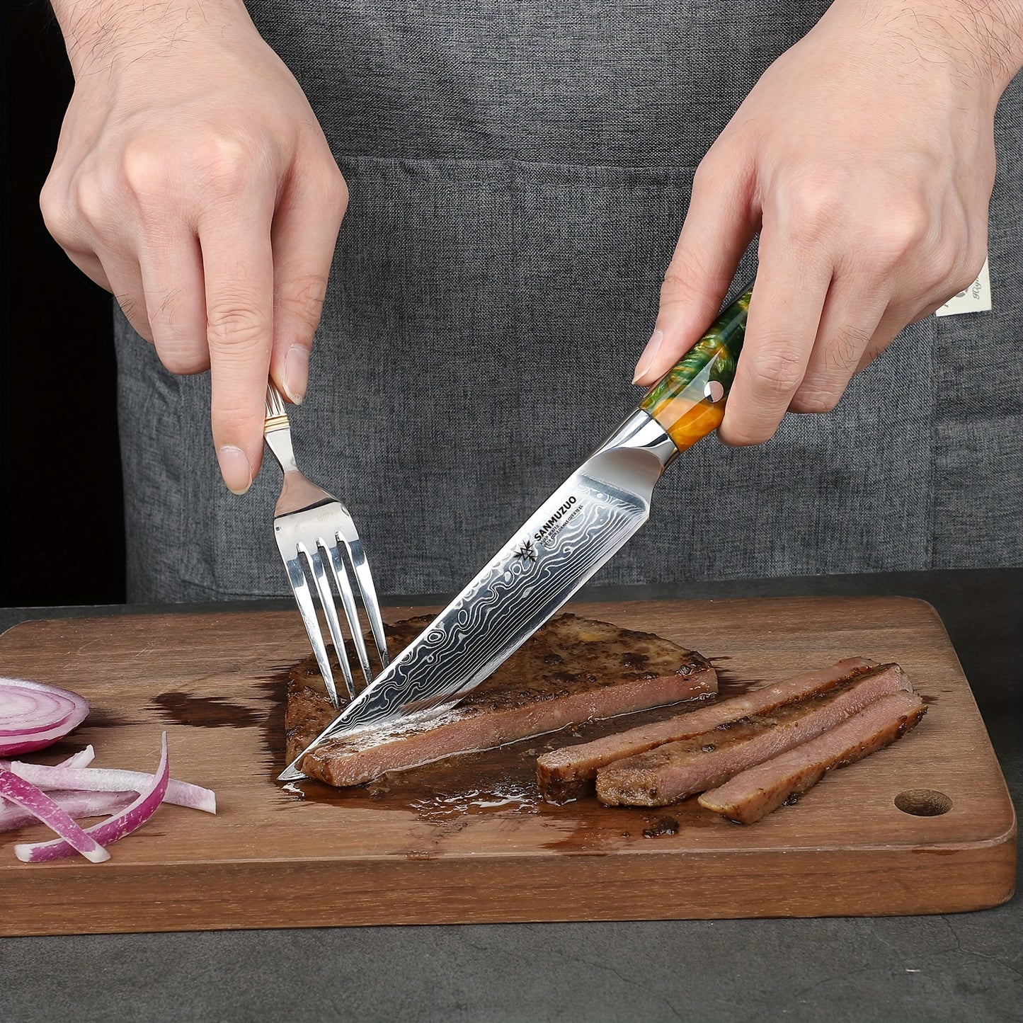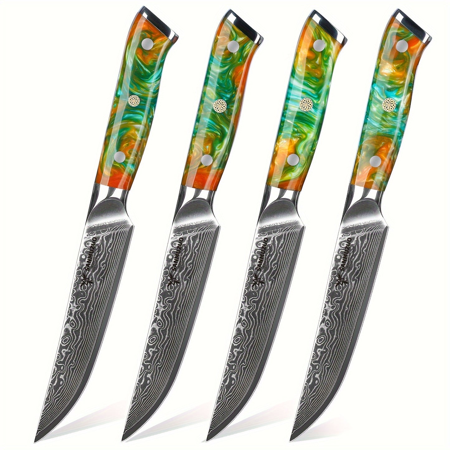 Damaszener-Steakmesser-Set mit 4 Stück, ultrascharfes, nicht gezahntes Küchen-Steakmesser 5 Zoll, ultrascharfer japanischer VG-10-Stahl mit Harzgriff, professionelles Küchenmesser, Fantasy Orange der Xuan-Serie