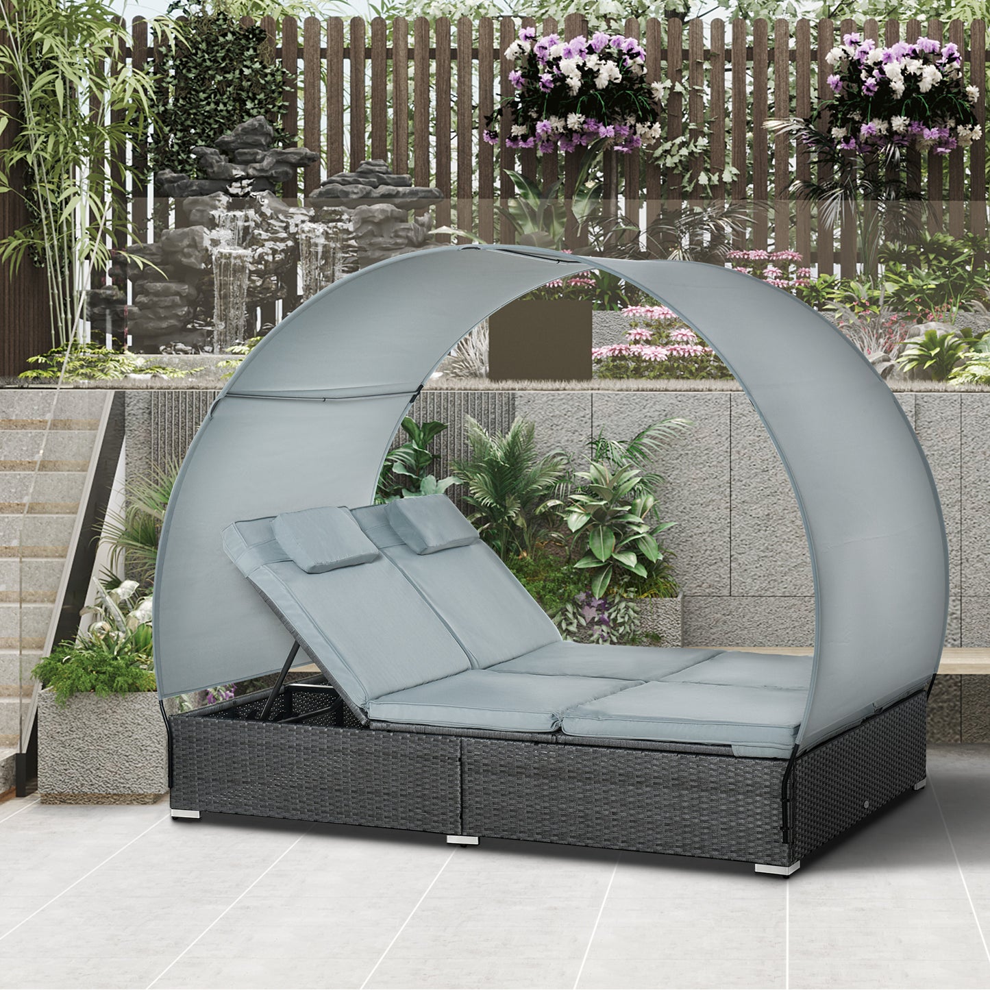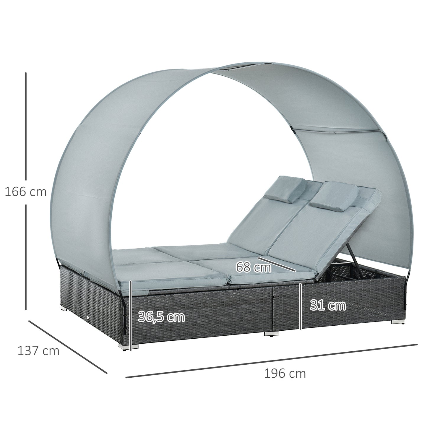 Outsunny Poly Rattan Doppelliege Gartenliege für 2 Personen mit Sonnendach Sonnenliege Polyester Stahl Grau 196 x 137 x 36,5 cm